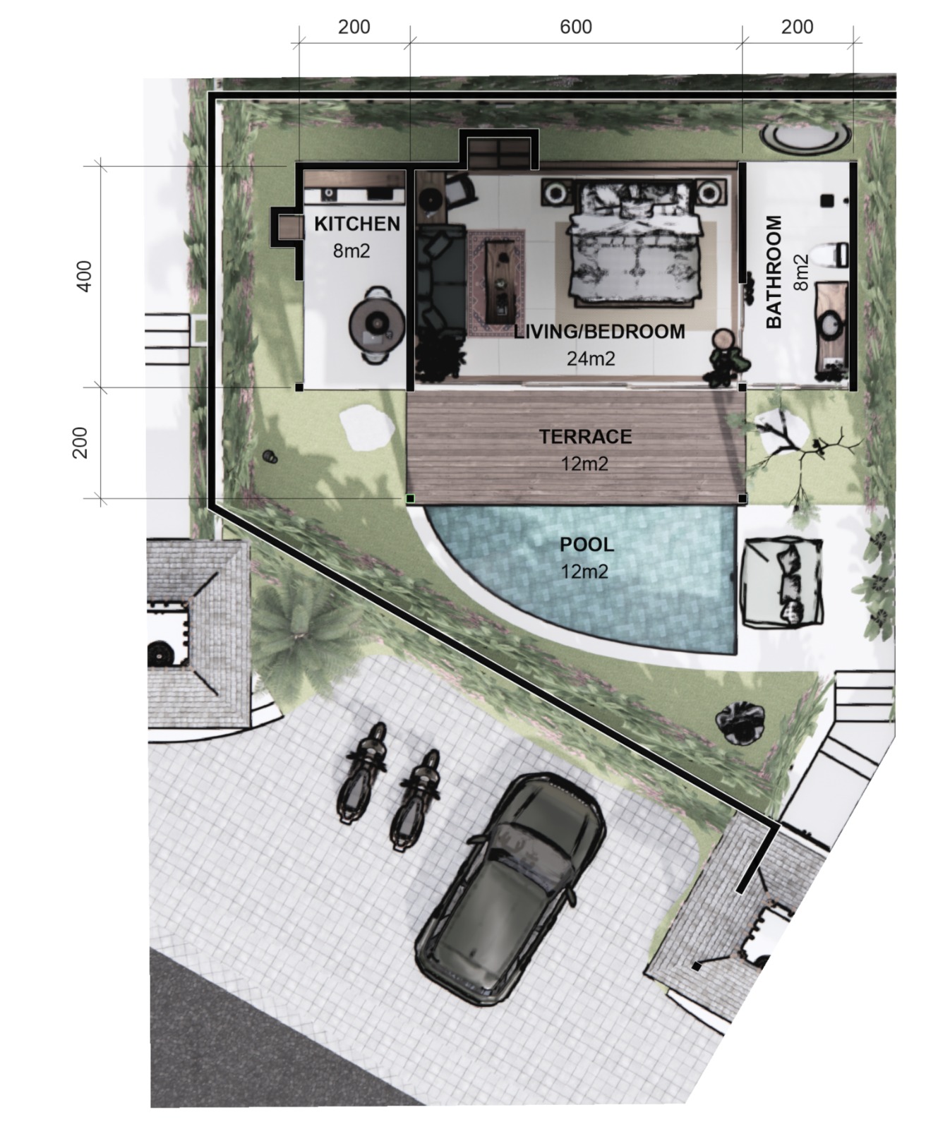 The project includes a collection of six studios and two private villas, created with a focus on natural materials, clean design, and a calm atmosphere.